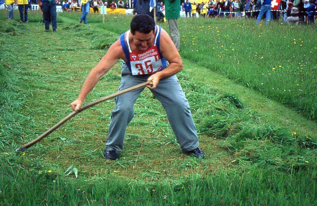 - Wie die Sense mit dem Wetzstein geschärft wird.